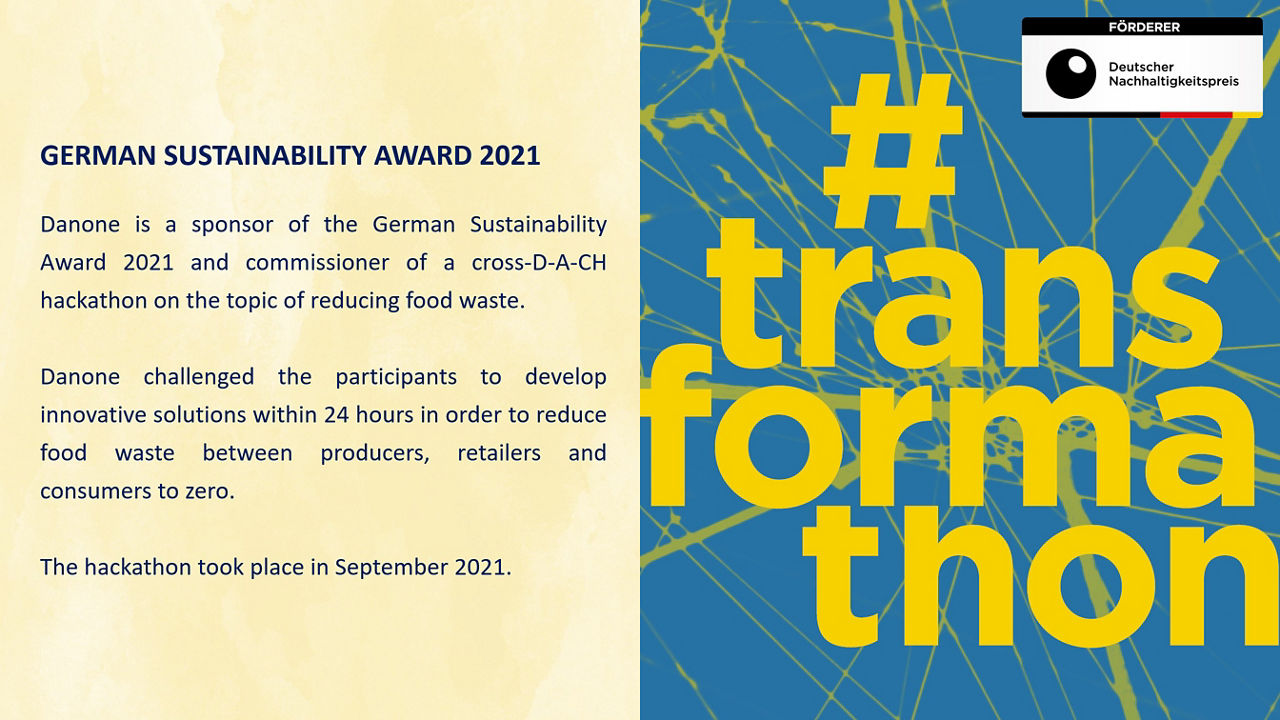 ésormais, ce service est également accessible en ligne pour nos gros clients, via notre plateforme de vente de liquidation en ligne. Sur ces canaux de vente, nous proposons exclusivement des produits qui ont une limite de fraîcheur minimale plus courte et qui sont vendus à des conditions avantageuses. Notre plateforme de vente de liquidation en ligne nous a permis de réduire encore plus les pertes de produits Danone. En 2021, le ministère allemand de l’Alimentation et de l’Agriculture a d’ailleurs attribué à notre plateforme de vente en ligne le prix « Trop bon pour la poubelle » dans la catégorie « Solutions numériques ».