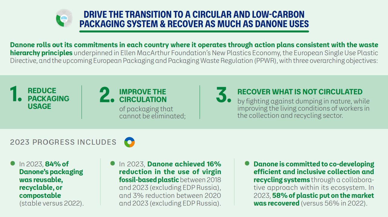 Danone unterstützt aktiv neue Recyclingtechnologien. Im Jahr 2022 hat das Unternehmen Partnerschaften mit Loop Industries geschlossen, um das Recycling von PET-Flaschen in geschlossenen Kreisläufen zu verbessern und das Recycling von schwer zu recycelnden Verpackungen und Materialien zu ermöglichen.