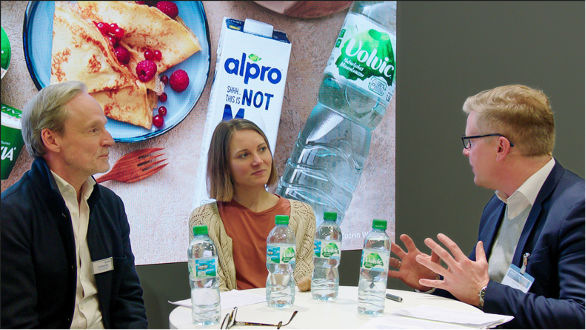 BU: Stefan Stohl, Leiter Unternehmenskommunikation Danone DACH, und Regina Regina Treutwein, Bereichsleitung Lebensmittelrettung und Logistik, von der Tafel Deutschland e.V., im Gespräch zum Thema „Lebensmittelverschwendung reduzieren“. Von links: Stefan Stohl, Regina Treutwein und HR1-Moderator Kai Völkel